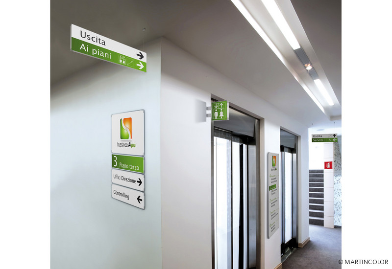 signcode suspension ist ein doppelseitiges Deckenschild mit zweifacher Abhängung am Stahlseil aus der Beschilderungsserie signcode. Es ist in vielen Grössen erhältlich. Damit macht signcode Ihre moderne und flexible Gebäudebeschilderung komplett. Das abgehängte Wegweiserschild signcode verfügt über eine transparente PS-Abdeckung, in die selbst ausgedruckte Papierseiten ganz einfach eingelegt und wieder ausgetauscht werden können. Der Austausch der Informationen ist schnell und ohne Werkzeug möglich. Natürlich kann die Abdeckung auch direkt bedruckt oder mit Folie beklebt werden, was ein das Öffnen der Hinweisschilder durch Unbefugte verhindert. Ein gephaster, diskreter Rahmen und die silber beschichteten Ecken aus ABS machen signcode zu einem variablen und eleganten Hingucker. Die Wegweisschilder der signcode-Linie sind geeignet zur Beschilderung von öffentlichen Einrichtungen, Krankenhäusern, Bürogebäuden und allen weiteren Gebäuden, in denen sie den Besuchern und Kunden dir richtige Orientierung geben.