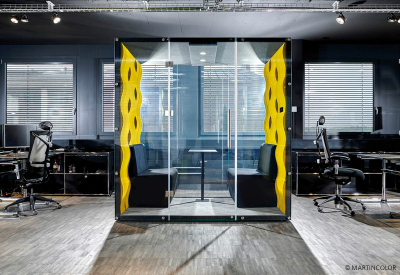 VANK Akustikboxen sind eine Oase der Ruhe in Großraumbüros und bei "open space" Bürokonzepten. Unsere Akustikboxen bieten als Raum-in-Raum-Lösung entspanntes, schallgeschützes Arbeiten - auch wenn es drumherum turbulent zugeht. Die Akustikboxen gibt es in verschiedenen Größen, sodass bis zu 6 Personen diese schallgeschützte Raum-in-Raum-Lösung nutzen können. In der Ausführung für eine Person kann sie für Telefongespräche oder als Rückzugsort für Momente besonderer Konzentration dienen. Größere Akustikboxen lassen sich für vertrauliche Videokonferenzen oder als Besprechungsraum einsetzen.