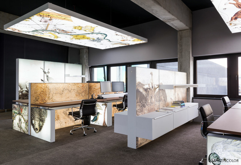 Für die Innenausstattung von attraktiven Büroräumen bietet sich er Einsatz von LED-Trennwänden an. Die hier gezeigten LED-Trennwände und LED-Raumteiler sind aus Aluminium gefertigt. Sie sind flexibel in der Größe und können in Sonderformaten ganz nach Kundenwunsch gefertigt werden. Unsere LED-Trennwände sind mit LED-Modulen ausgestattet, die jede Trennwand doppelseitig durchleuchten. Die Bespielung der LED-Raumteiler erfolgt mit Textilspanndias, die mit einer Gummilippe in die Systemrahmen eingesteckt werden. Durch den schnellen und komfortablen Wechsel der individuellen Bespielung, kann jedes Büro schnell mit einem neuen Branding versehen werden. Genauso einfach können auch LED-Deckenabhängungen installiert und mit individuellen Textilspanndias versehen werden.