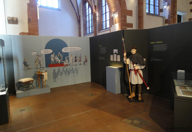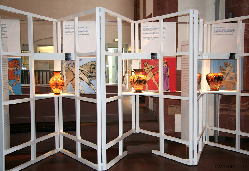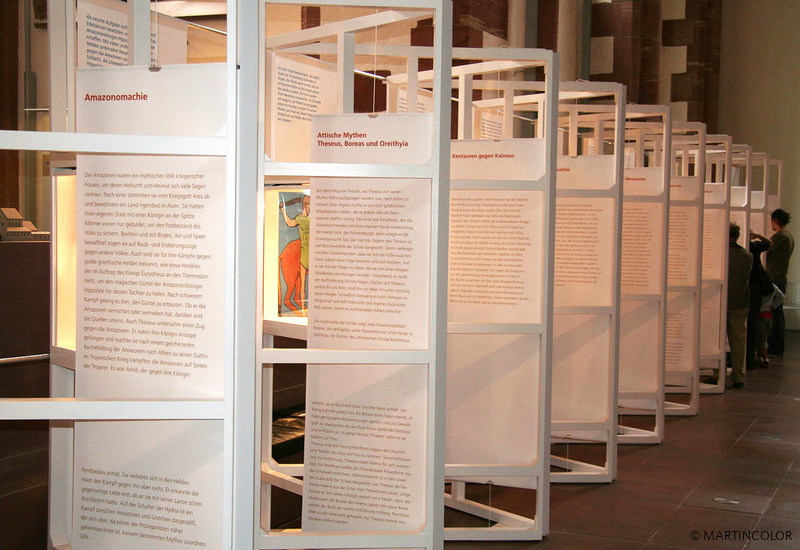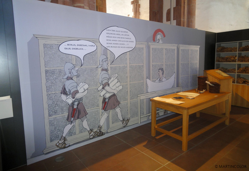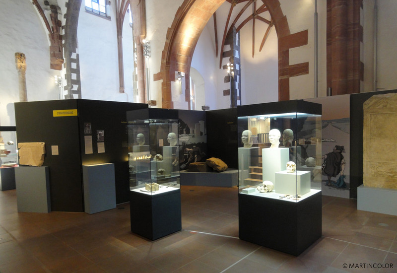 Martincolor produced numerous large-format textile prints in the format of 240 x 200 cm for the exhibition "Dangerous Pavement" in the Archaeological Museum, which were inserted into aluminum clamping frames by means of a rubber lip. In addition to wall coverings and floor adhesives also wallpaper and other fabric banners would be created. A special highlight was the life-sized cut out Roman soldiers. All assembly and erection work was carried out by the MARTINCOLOR assembly team. For more information on our exhibition service, please contact Micheline Beilner at Tel. 069-756080-73.