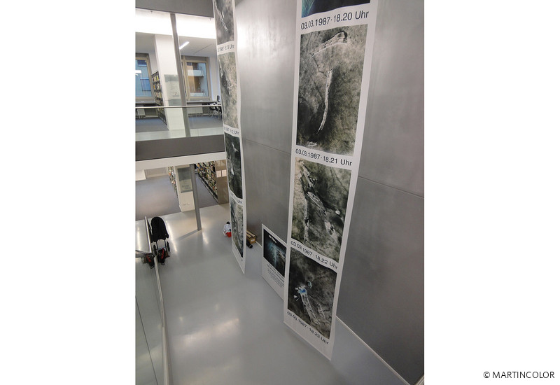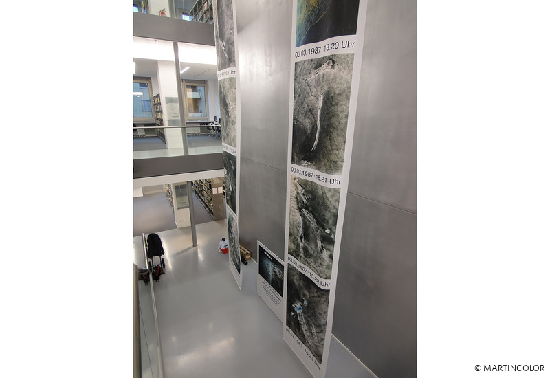 The focus is on the installation "EIS-ZEICHEN-ZEIT", which guests will come across at the Central Library (Hasengasse 4) from 28 January to 12 February. On two 13-meter-long strips of fabric that run through the entire three floors of the public library, Wiesner has banned "fleeting signs of nature". The panels were produced by MARTINCOLOR on special HighTec material, then assembled according to the requirements and professionally assembled on site by the MARTINCOLOR assembly team.