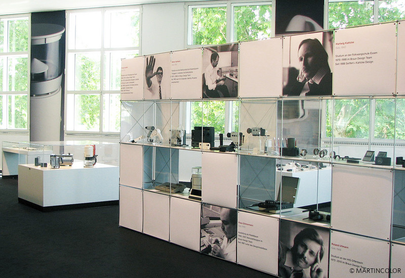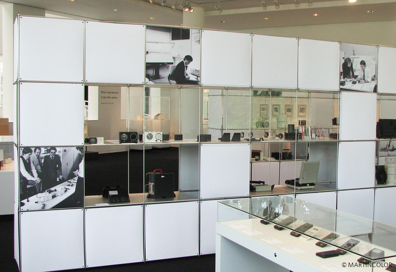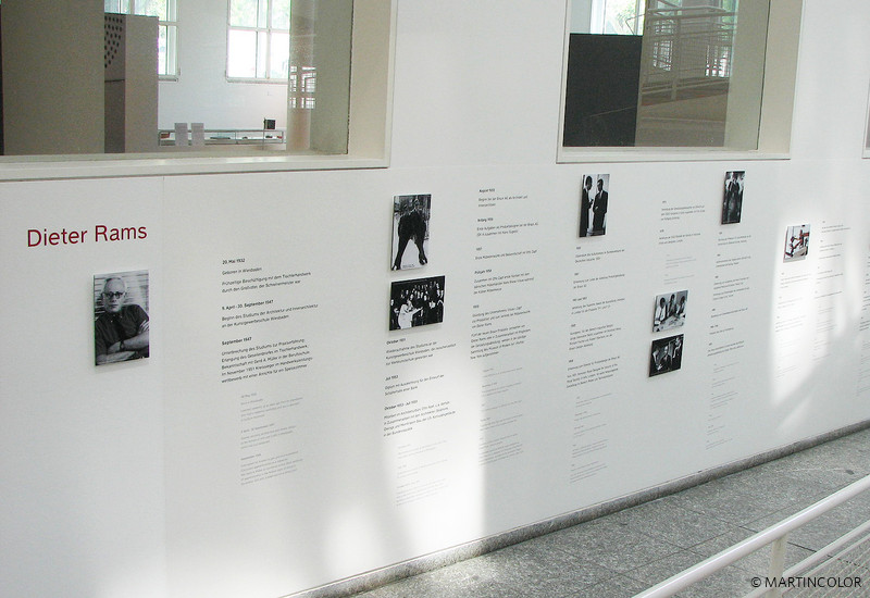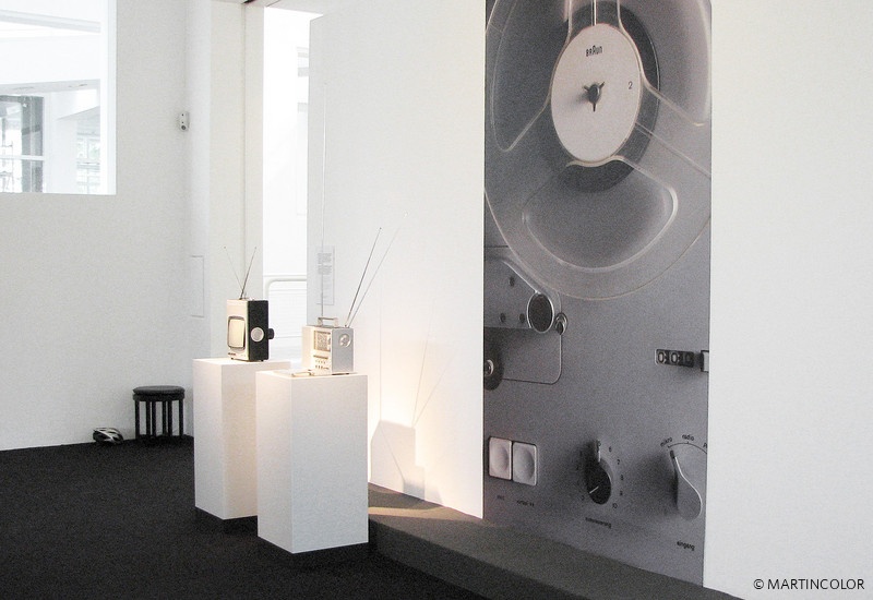 For this extraordinary exhibition, the complete photo, picture and text production was taken over by MARTINCOLOR. In the exhibition rooms numerous large white walls offered themselves to the "DIGITAL WALL COVERING". Due to this special printing process, MARTINCOLOR printed wallpapers with individual motifs and stuck them directly in the exhibition area. For example, Dieter Rams designs could be displayed on the walls over a large area at a low cost. For the optimal presentation of the smaller BRAUN products Burghard Leitner constructive systems were used, which were provided with individual pictures and texts.