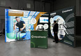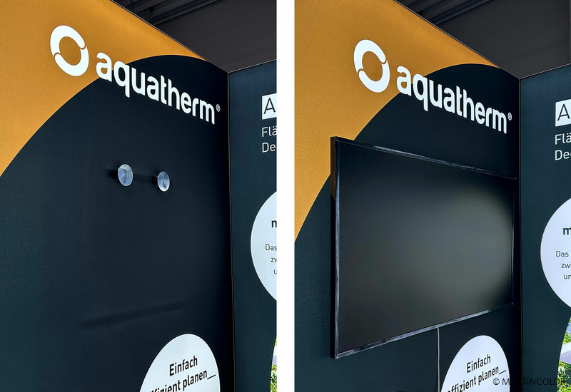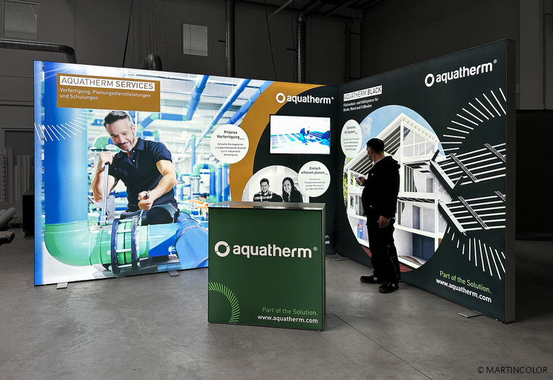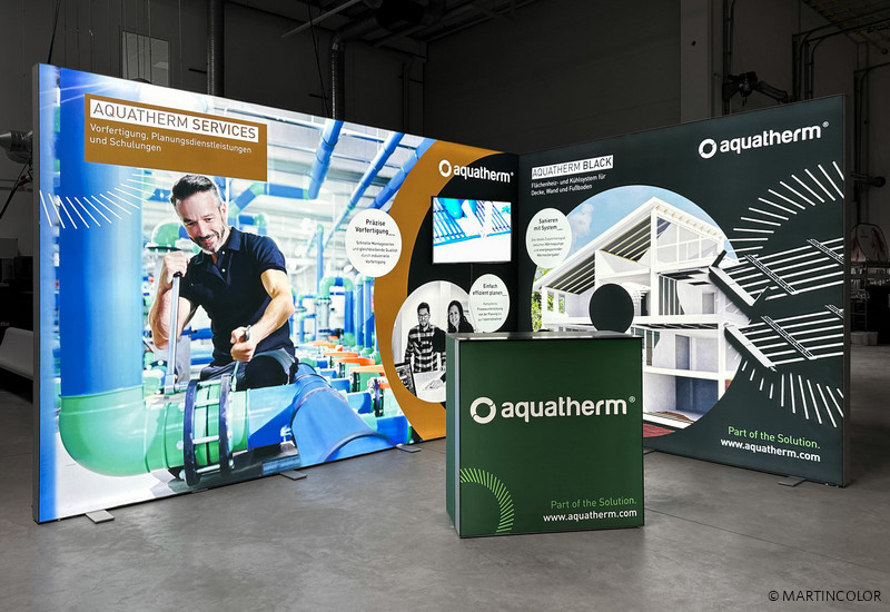 The company "aquatherm GmbH" opted for the brilliant, light-flooded LED exhibition system ALU STAR. The systems of different widths allow for several positioning variants and always ensure a great appearance. A monitor mount was integrated into one of the systems – as an additional advertising medium for the company. The ALU STAR PLUS LED counter that goes with the exhibition system has a rechargeable battery and lights up all by itself. Finally no more power cables on the ground! The lockable set of doors on the back of the counter guarantees additional security.