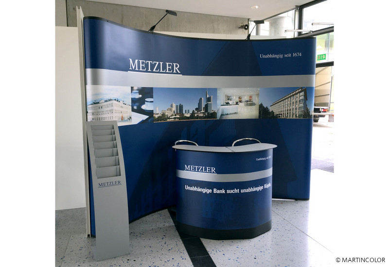 Folding displays are ideal exhibition walls when it comes to fast assembly and practical transport. This is particularly important when short-term assignments, as here for our customer Bankhaus Metzler, are on the agenda. Many of our customers, including Bankhaus Metzler, also use our Germany-wide assembly and dismantling service.