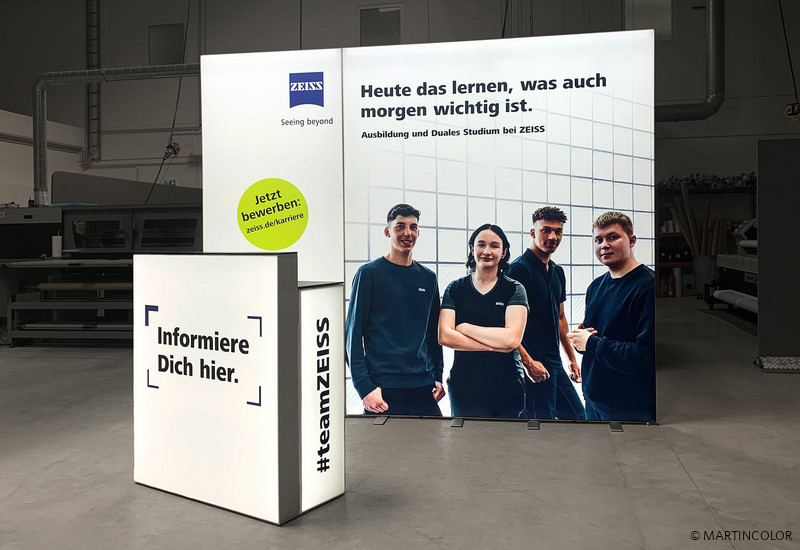 Our customer "Carl Zeiss" attached particular importance to a concise presentation of his company at the trade fair. The decision was made without hesitation in favor of the innovative LED exhibition wall ALU LightUp. Available in different system heights and widths, the individual system modules can be easily plugged together or positioned variably, depending on how you want to set up the room. One thing is guaranteed in any case: an ingenious, light-flooded and unforgettable trade fair appearance! The 8 cm wide aluminum profiles ensure stability. Your individual advertising message is then stretched over this without creases and with the necessary power supply you get the desired result, which can absolutely be shown. The LED walls can be covered with foldable slide material on one or both sides.
