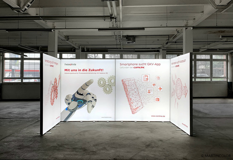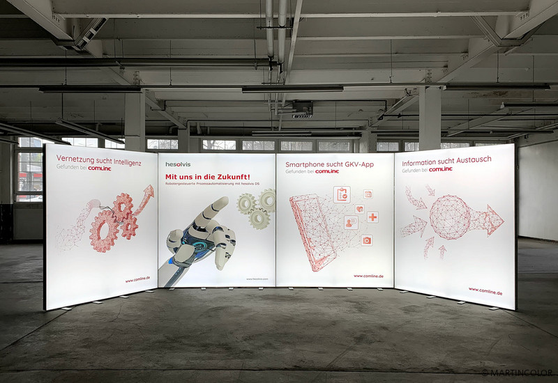 With our ALU LightUp LED exhibition walls, even larger exhibition stand processes can be set up very easily. ALU Light Up LED displays are available in widths of 85 cm, 100 cm and 200 cm. Depending on the stand area, the different system widths can be put together, so that a new stand impression is always created. It is particularly practical that all LED light walls can always be provided with new coverings that are individually tailored to the respective trade fair application. That was also the reason for Comline AG to choose ALU LightUp. More information about the ALU LightUp LED exhibition stands can be found at https://www.martincolor.de/messestaende/led-messestaende/alu-light-up.html
