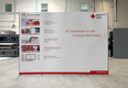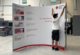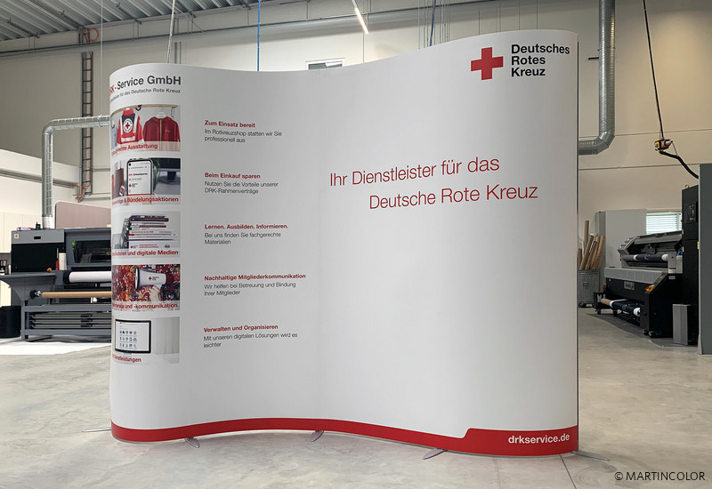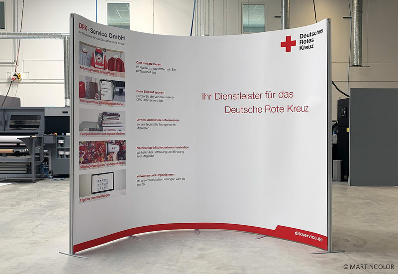 The flexible exhibition wall ISOframe Wave was the optimal solution for our customer "Deutsches Rotes Kreuz" to clearly present the most important points of the company at a glance. The patented Flexi-Link connection makes it possible to bring the exhibition wall into different shapes. The system can be expanded as desired with suitable extension modules and made more effective with shelves, table modules and monitors.