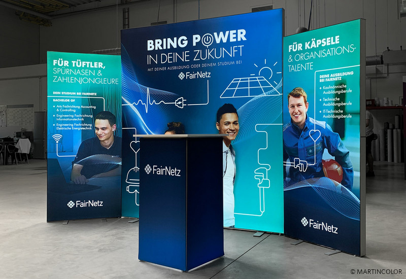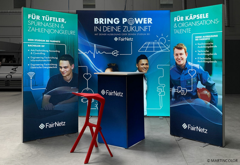 With its concise graphic motif, this LED exhibition stand is an absolute luminous jewel on the exhibition grounds. Since the youth can only feel addressed! Our customer opted for the lighting systems ALU LightUp and PIXLIP POP with the addition of an OCTAlumina standing table. The bright LEDs are preinstalled in the systems. The textile covering can be easily attached to the profiles. And you get a great glow effect! The whole thing can be assembled and disassembled in no time and stowed compactly in robust transport cases and trolleys.