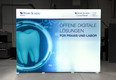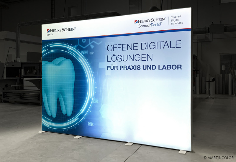 For the customer „Henry Schein“, MARTINCOLOR produced the foldable slide textile covering for the LED lighting system PIXLIP GO. This system consists of white plastic profiles and is available in different sizes. These can also be easily inserted into each other without the aid of tools. The highly efficient Osram LED modules guarantee uniform illumination of the advertising message printed on textile material. The graphic covering can be replaced quickly and easily at any time. This means that the company‘s image is always up to date. The lightweight plastic construction guarantees easy transport in a convenient carry bag.
