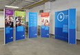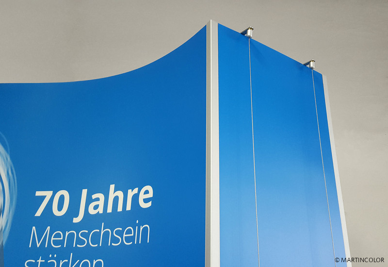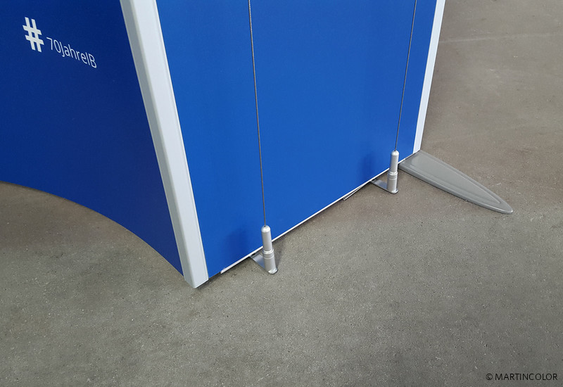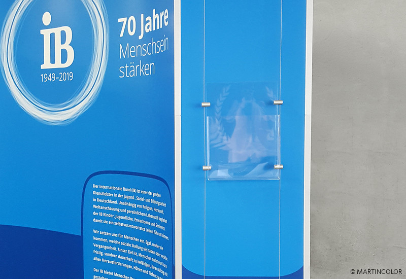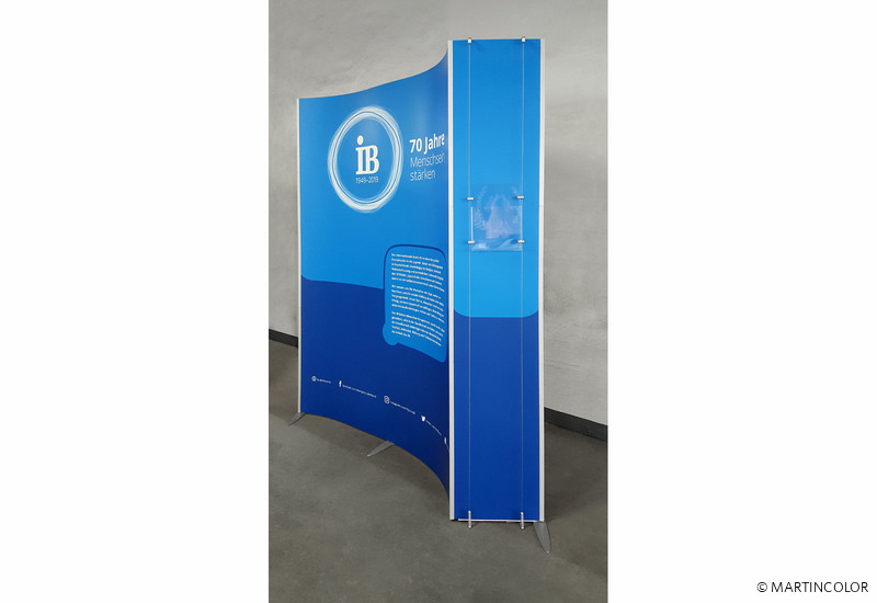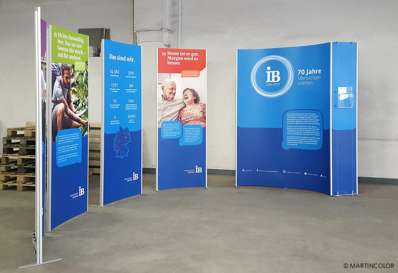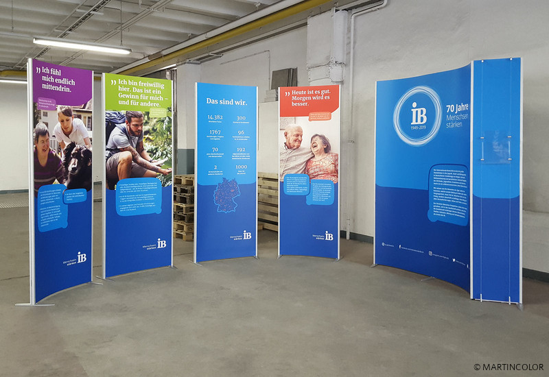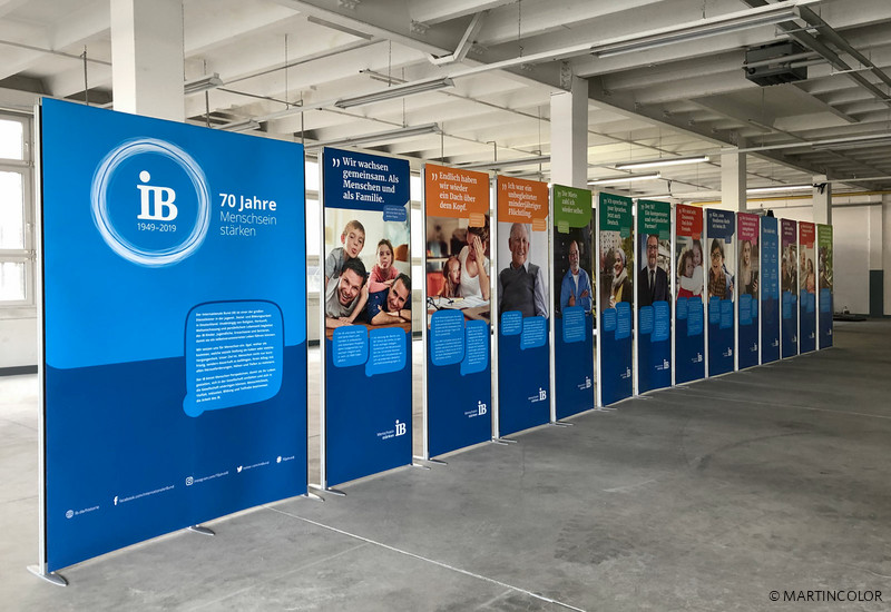 A special application for the flexible stand system ISOframe Wave was realized for our customer Internationaler Bund. Normally, ISOframe Wave is used for large-format exhibition walls, which are to be adapted flexibly to the respective floor space. At the traveling exhibition marking the 70th anniversary of the IB, a new exhibition format for ISOframe Wave was planned. Because ISOframe Wave can also be used as a single stand, making it particularly flexible and individually adjustable. Convince yourself in our showroom of the versatile use of ISOframe wave.