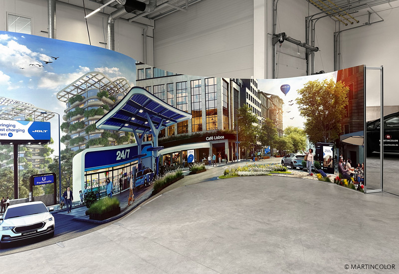This exhibition system with its patented Flexi-Link connections allows numerous placement options in the given space. It can be bent or stretched as desired. The 20 à 80 cm wide panels that MARTINCOLOR produced for the customer „JOLT Energy GMBH“ could actually have been extended even further, thanks to the Flexi-Link connectors. That is the great advantage of this system. Of course, the system can then be fitted with end caps to achieve a neat finish. Assembly is quick, easy and tool-free. Nevertheless, our assembly team will be happy to assist you with assembly or dismantling. With this flexible exhibition stand, you can also integrate shelves, table elements and/or monitors. The ISOframe wave is available in different sizes.