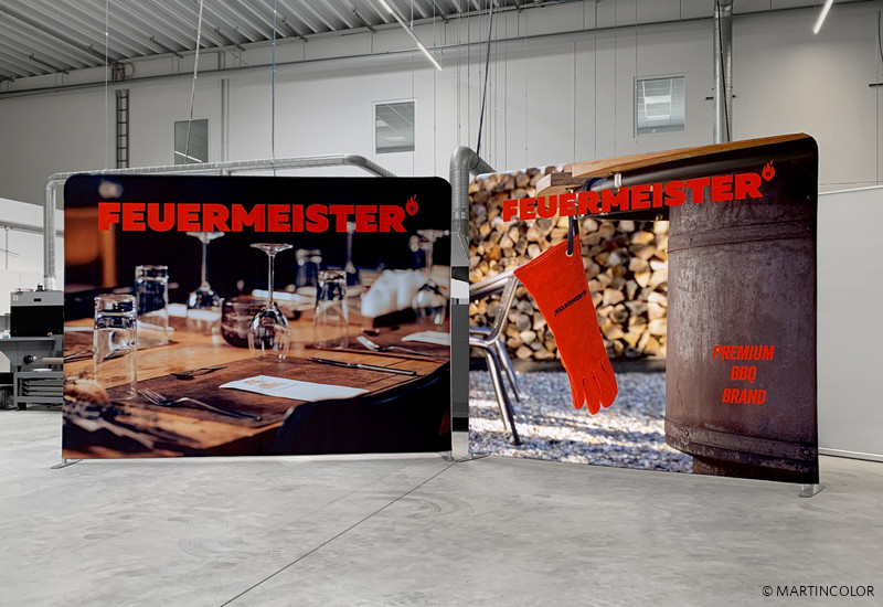 MARTINCOLOR produced 2 ZippWall Straight in different sizes for the customer „Jungfleisch GmbH - Feuermeister“. The assembly and disassembly of this system is absolutely problem-free and child‘s play, in that the system rods are plugged together with a click method. The individually designed stretch textile print can then be pulled over like a sock and zipped up. A big advantage of this inexpensive exhibition wall is its low weight and the fact that it can be easily transported in a practical trolley.