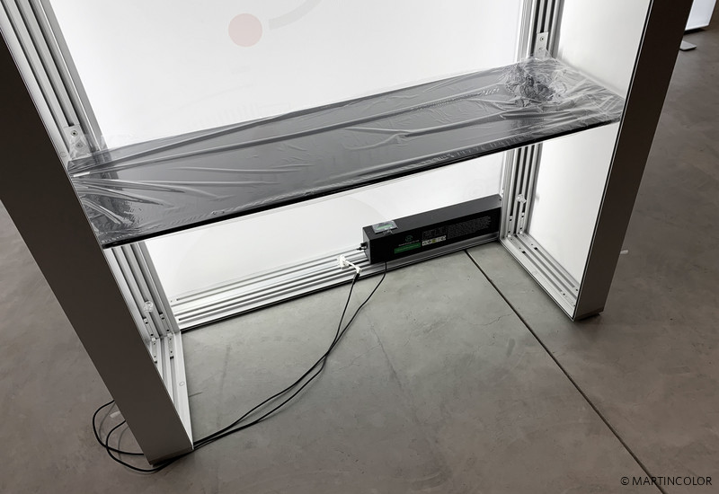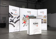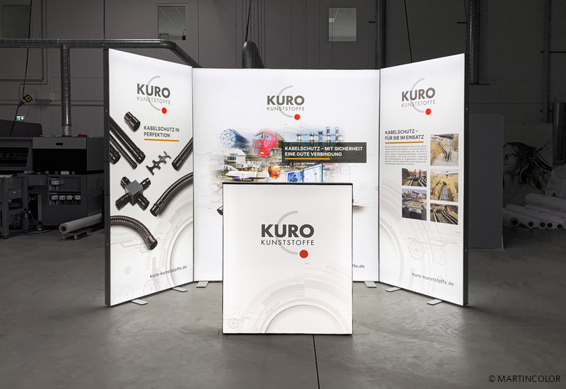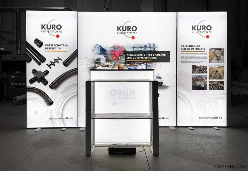 Brand new in our trade fair counter program is the LED counter ALU STAR MAX, shown here in combination with the LED trade fair wall ALU LightUp. The LED counter MAX has an illuminated counter front of W: 100 cm x H: 120 cm and is therefore a real eye-catcher at your trade fair or event. ALU STAR MAX is particularly eye-catching when several counters are placed next to each other. The new light counter from the ALU STAR family has a stable shelf at the back. Another new feature is that many of our LED counters can be equipped with a rechargeable battery. This can also be seen on the pictures of the KURO LED counter. With this high-performance battery, the ALU STAR MAX counter lights up to 9 hours without an external power supply. Do you have any questions about which other LED displays can be equipped with a battery? Then call us. We will advise you competently and comprehensively by phone (+49) 69 - 756080-84.