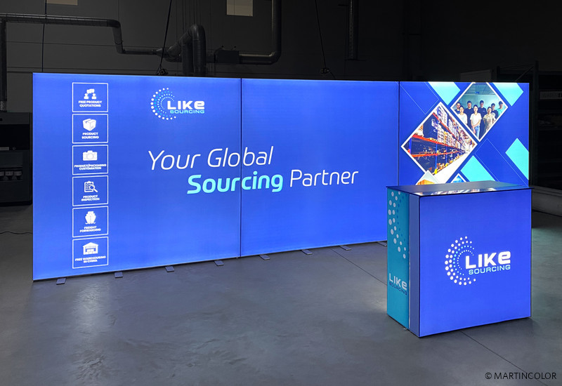 For the company "Like Sourcing", Martincolor printed textile tension slides, processed them and mounted them in the aluminum frames. The mobile LED display is inexpensive and fulfills its purpose: to come out as an absolute eye-catcher. The lined-up squares form an elongated illuminated wall. This makes it possible to let the individual design run over several meters. The advertising message can be exchanged at any time and ensures a simple update of the company's presence.