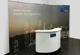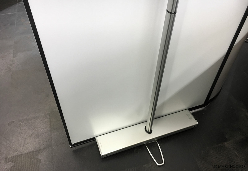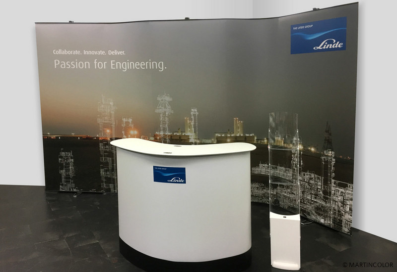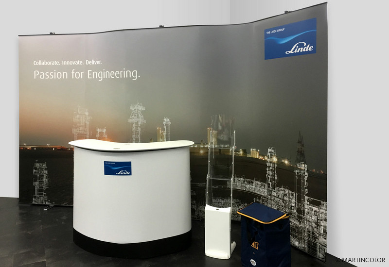 In addition to the popular ISOframe Wave exhibition system, MARTINCOLOR also offers another, flexible exhibition stand system. This is the system LinkWall. LinkWall consists of a sturdy cassette banner system in 90 cm width. A flexibly movable connection link allows multiple cassette banner systems to be interconnected. The connection links are available in two widths (27 cm or 60 cm) and can be flexibly bent. For our customer Linde AG, three of these cassette banners were provided with two 60 cm wide connection links. The exhibition wall can be bent on these connecting links. However, the banners inside the cassettes are not bendable. Depending on requirements, any number of cassette banner systems can be connected to one another. Link Wall is therefore also suitable for U- and L-shaped stands. LinkWall is available in two system heights: 220 cm and 250 cm. More information about this system can be found at https://www.martincolor.de/messestaende/flexible-messestaende/linkwall.html