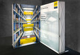 Psb intralogistics GmbH is one of the leading European companies in the field of intralogistics. MARTINCOLOR has been producing high-quality presentation and presentation systems for the company's showroom for many years. These systems are also used by psp for smaller trade fairs, in-house presentations and sales events. Especially in such events, it is important to stand out with his achievements especially in the eye. Thus, the use of large-sized light walls offers. So far, the construction and dismantling of a large-scale light display was complicated and time-consuming. By developing the GRID Lightbox, MARTINCOLOR offers a solution to this problem. The GRID Lightbox is the first foldable and large-scale luminaire wall worldwide. The basic structure of the GRID Lightbox consists of a spider framework, which is simply pulled apart or pulled together for assembly and disassembly. Rollable power LED curtains are then hung in the system fields. Subsequently, rails with a groove are attached to the system edges, into which the slide tension is introduced. Finished! The GRID Lightbox is available in five different sizes. Several walls can be connected together to form an even larger wall or "over corner". There are special adapters for this. Thus, the light walls are also used by psb intralogistics GmbH. It deliberately chose 150 wide and 230 cm high systems, which can be individually put together as needed.