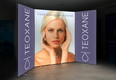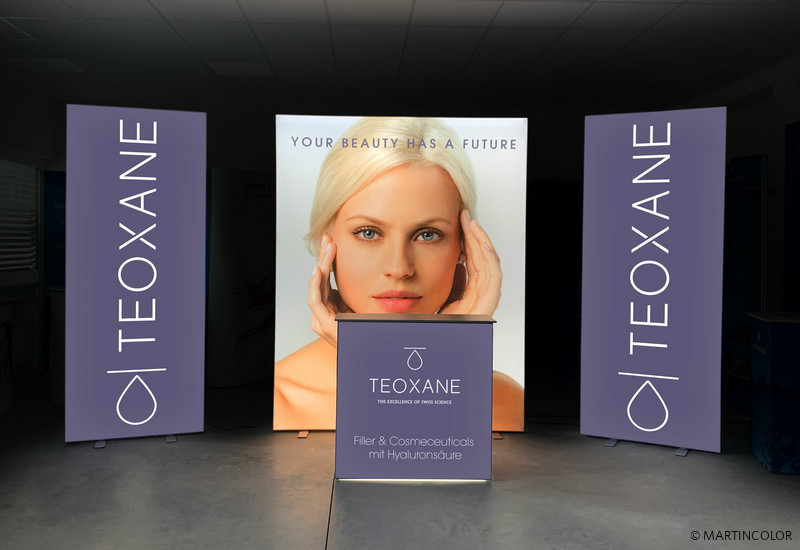 Our ALU LightUp LED exhibition stands are a real miracle! Because the modular LED exhibition wall ALU LightUp is available in three different system widths: 85 cm, 100 cm and 200 cm. All LED walls can be combined with one another. Your LED exhibition stand can either be used as a long, straight illuminated wall, as an LED exhibition stand with "wings" or as an LED corner stand. Since the LED walls are not permanently connected, you can quickly and easily set up a different or new stand at any time. Of course, only one LED stand segment can be used for smaller trade fairs and events. In the example of our customer Teoxane, e.g. a 100 cm wide LED frame used individually at certain events. Due to the double-sided equipment with textile light slides, each ALU LightUp system can also be wonderfully placed in the middle of a room.