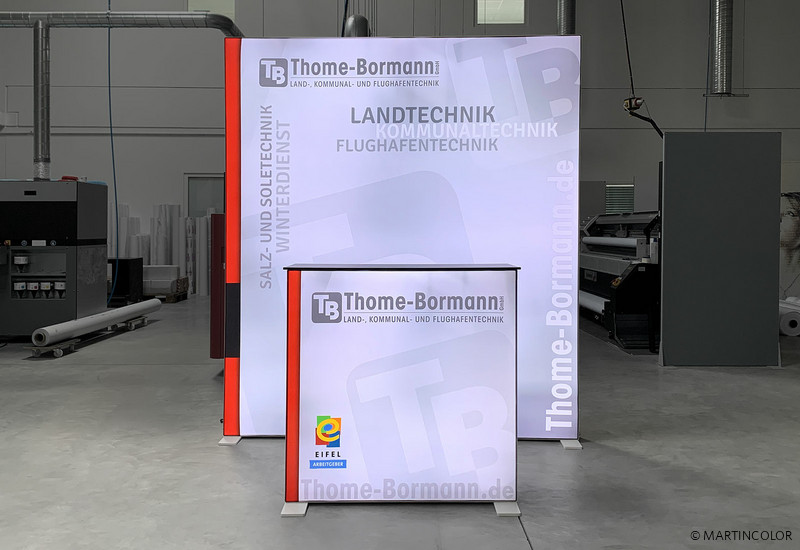 For a particularly impressive advertising presence, the company "Thome-Bormann GmbH" has chosen the "convienience" LED exhibition stand: The PIXLIP GO illuminated wall with accompanying LED counter. Due to the stable plastic profiles, which are 12 cm wide, the illuminated display can be set up easily, uncomplicated and above all without tools. The LED modules are already integrated into the profile frame and provide a strong and even illumination. The individual textile covering can be easily mounted to the system with a rubber cord and ensures a professional appearance, no matter at which position on the booth. The PIXLIP GO LED trade show display is available in different system widths: 85cm, 100cm, 200cm and 300cm. If you have any further questions, please contact us at 069/75 60 80-0. We will be glad to advise you!