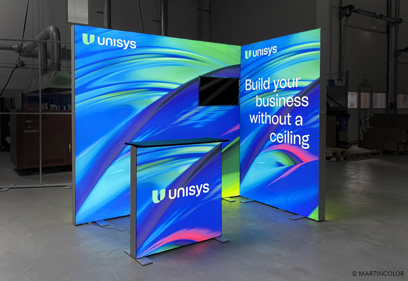 For the customer "Unisys Deutschland GmbH" we produced large-format ALU STAR illuminated walls in two different sizes. The LED illuminated systems, made of fine aluminium, were equipped with a colorful slide cover on the front and back. This resulted in an impressive color scheme, a real eye-catcher on the entire exhibition grounds. The easily adjustable illuminated systems can be set up in a flash, without any tools! The pre-assembled, bright power LEDs are located in the 12 cm wide profiles. The various positioning options for the LED walls (as a corner, at any angle, next to each other, offset, etc.) create an optimal interior design. The whole thing was upgraded with an elegant ALU STAR LED counter that also lights up on both sides.