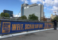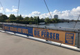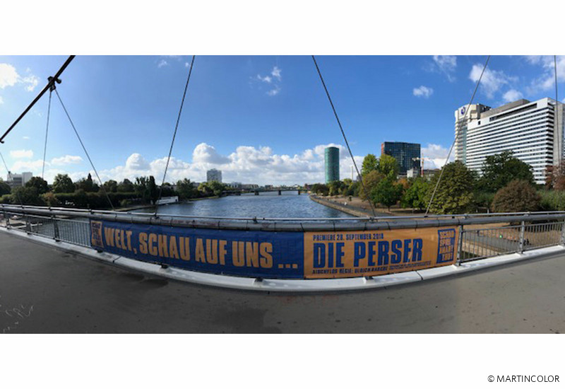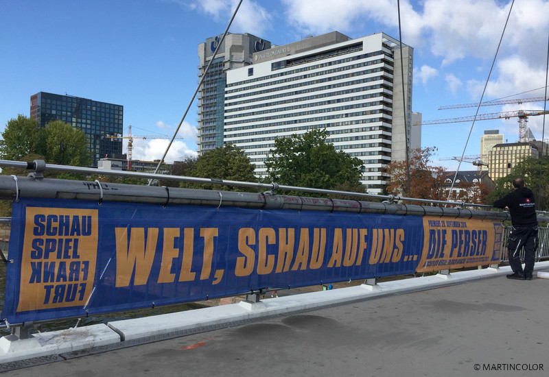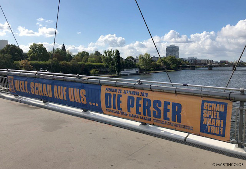 MARTINCOLOR produced and installed large format bridge banners for wind-permeable mesh material for the Schauspiel Frankfurt.