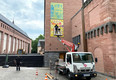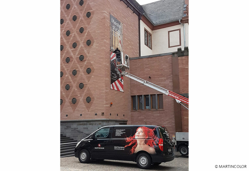 The Historical Museum in Frankfurt is showing the exhibitions Werk*Stoff*Textil and Clothes in Motion - Women's Fashion since 1850 until February 21, 2021. MARTINCOLOR produced large-format facade banners on wind-permeable mesh material (netting vinyl) for the effective announcement of the exhibitions. With the help of a riser, our fitters attached the facade banner to the wall of the museum.