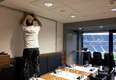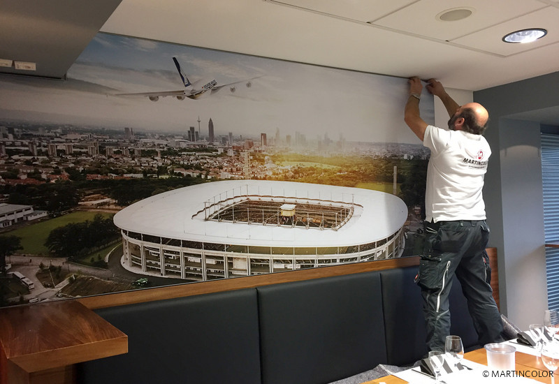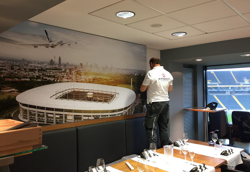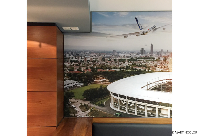 On behalf of the 744 agency, the MC assembly team installed a large textile clamping frame in the Singapore Airlines VIP Lounge of the Frankfurt Commerzbank Arena.