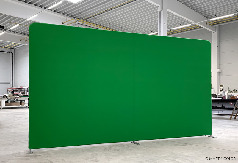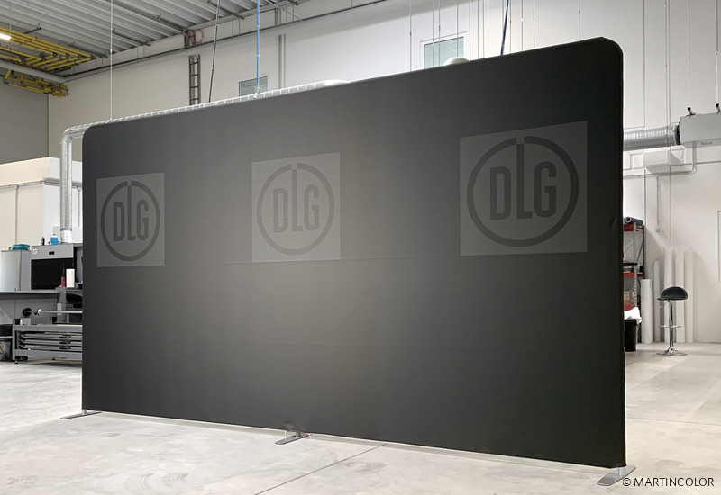 For internal and external video conferences, the DLG e.V. decided to use a 4 m wide rear wall. The wall system has an individual print on the front, which is provided with a special green screen material on the back.