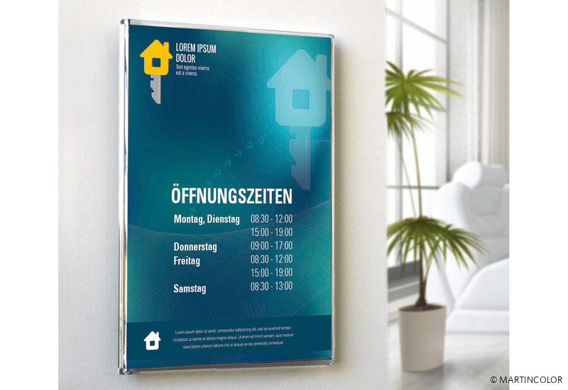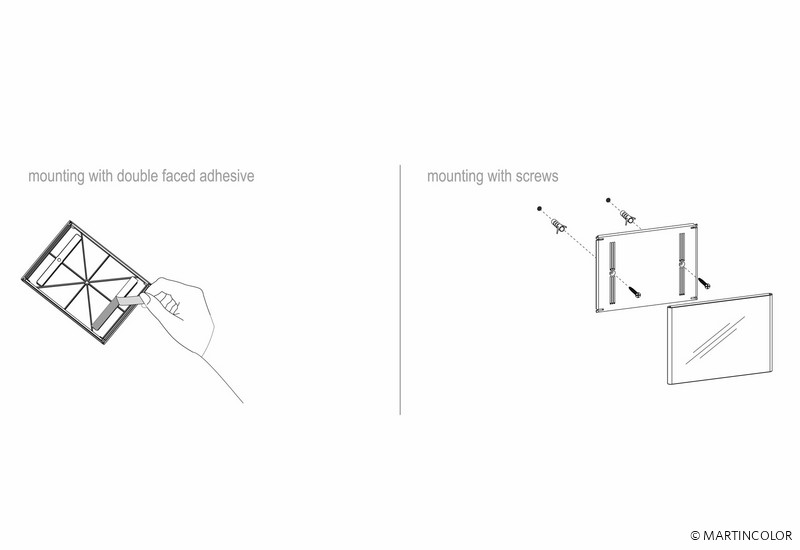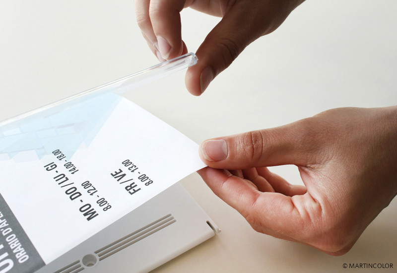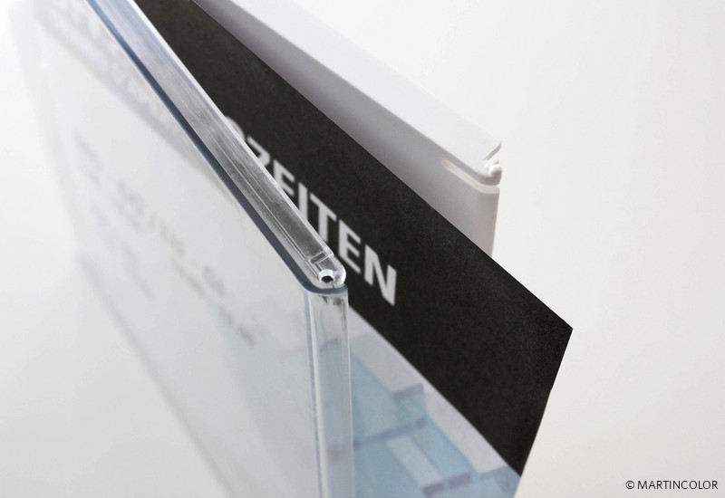 The smartquick door is small, practical and quick to install. Smartquick consists of high-quality polycarbonate Injection molding can be easily and quickly mounted on the wall. Whether with screw and dowel or double-sided tank tape on smooth surfaces - the smartquick is in use wherever information is to be presented frameless and dust-proof. For exchange, the transparent cover opens to the left or right. The back wall is white and forms the perfect background for all information introduced.