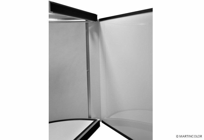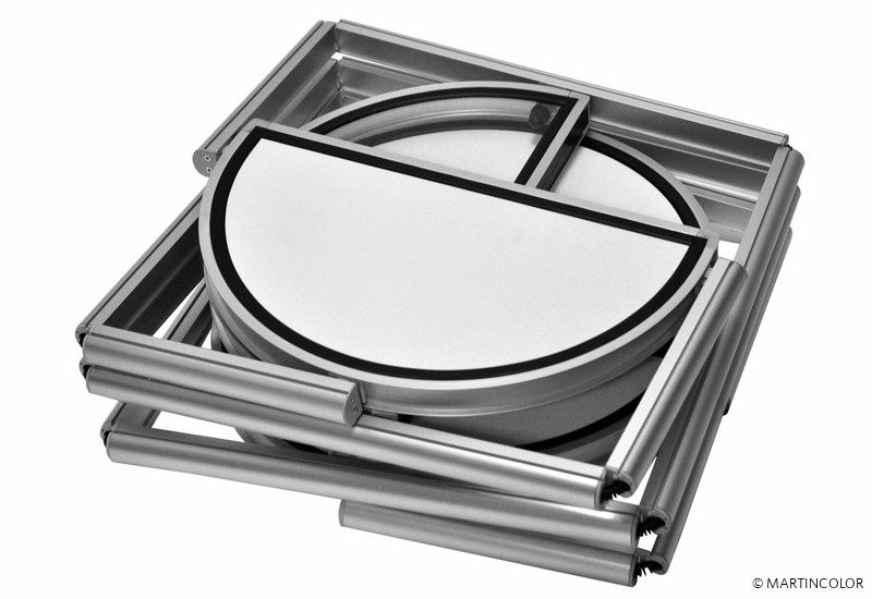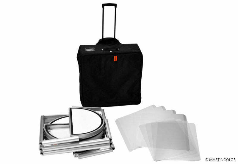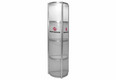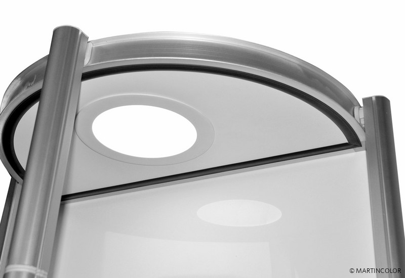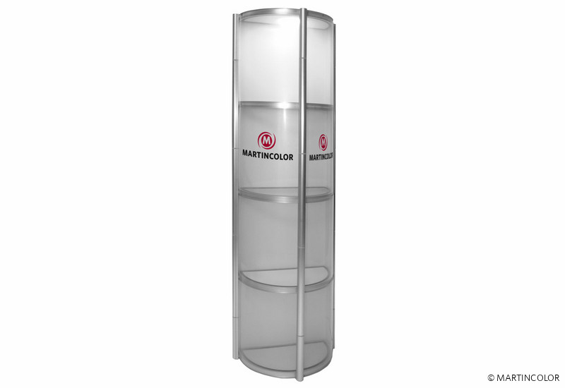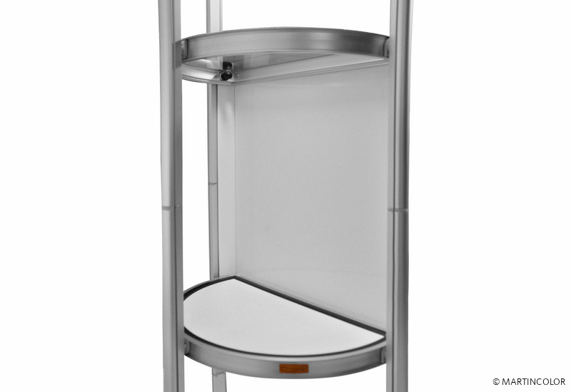 Brand new in our range of foldable display cabinets is the semicircular twist column. All columns from the Twist family are extraordinary showcase displays that are initially folded into a small trolley and can be unfolded into a high-quality showcase column during assembly with just one turn. The fields of vision of the showcase column Twist are fitted with transparent polyester. When transporting this has great advantages over glass! Polyester is hardwearing, transportable and lightweight. If necessary, the column can be equipped acuh with additional graphic panels to personalize the system. All foldable showcases from the Twist family are equipped in the top with a power LED spotlight in the top. The diameter of the semicircular Twist showcase column is 56 cm, the system height is 200 cm and the weight incl. Panels is 35 kg. Each intermediate floor can be loaded with 15 kg.