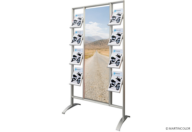 Combi soistes combines banner and catalog presentation in one system. The integrated plastic injection-molded shelves can be tilted four times and provide sufficient space for DIN A4 brochures. For the attachment of the graphic print in the format 65 cm x 143 cm simply push the support rods through the upper and lower hemstitch of the banner. The height of the handrails is individually adjustable, so that shorter banners can be used. The complete system is delivered in a transport cardboard box.
