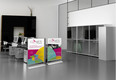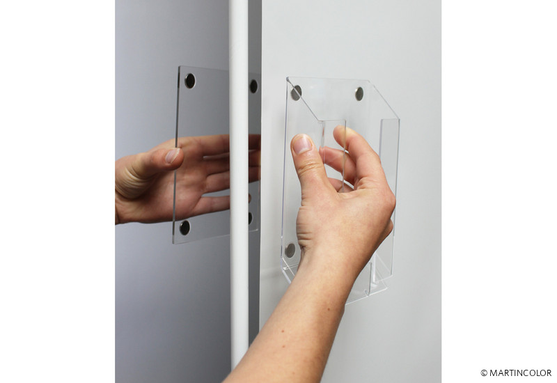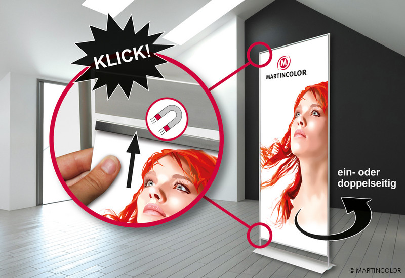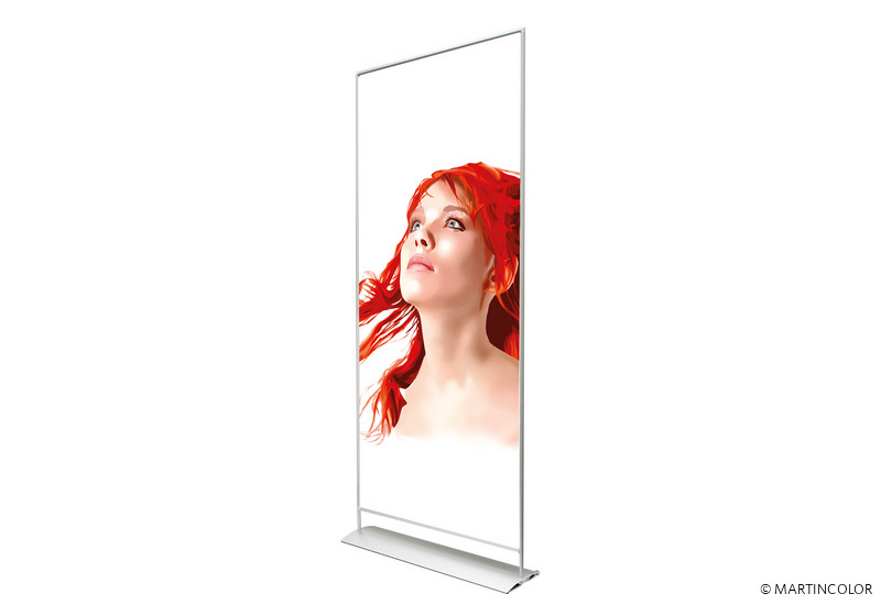 Finally there is a banner system that can be set up as fast as a rollup. And - you can change the graphics banner REALLY yourself! This is made possible by the patented magnet technology from myWizard. With a "click", the banner with a metal bar is stretched into the myWizard profile. Finished! So a change of motif is really fun and done in seconds. MyWizard can be provided with a double-sided printed banner. The system is available in heights (163 cm, 203 cm) and three widths (60 cm, 85 cm, 100 cm). The structure of the basic system is very easy and is done by simple plug & screw. The high quality materials MyWizard is particularly stable and durable. Base and system frame are made of silver anodized aluminum.