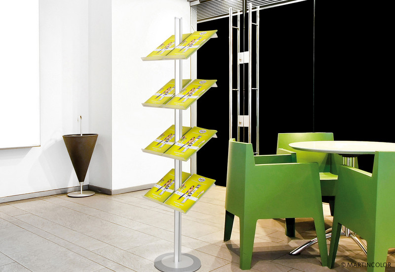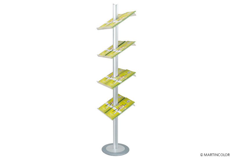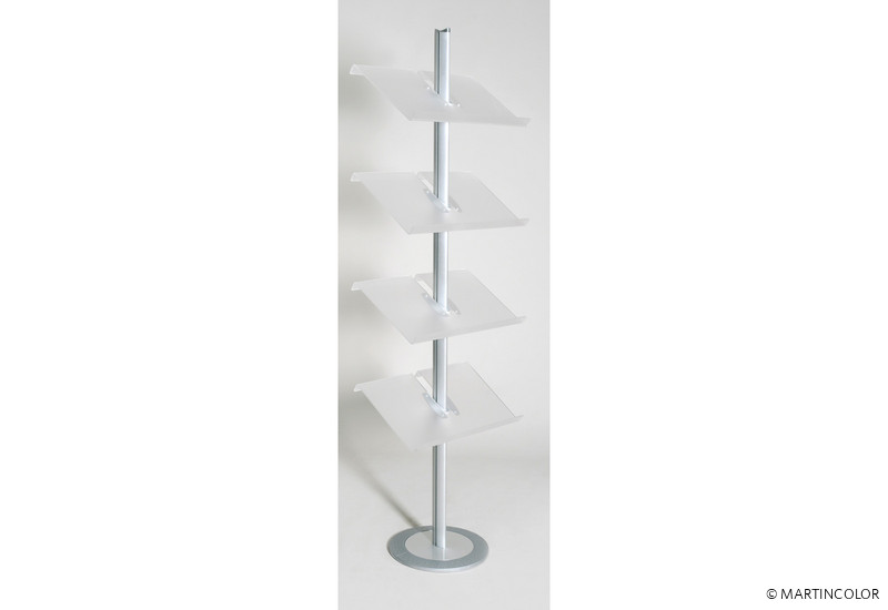 ZIP Palo is a freestanding and stable floor display for 8 leaflets in A4 format or slightly larger. The acrylic shelves can be tilted horizontally 4-fold and are infinitely adjustable in height. Whether single sheet or catalog presentation; They always look good with the elegantly satined acrylic shelves.