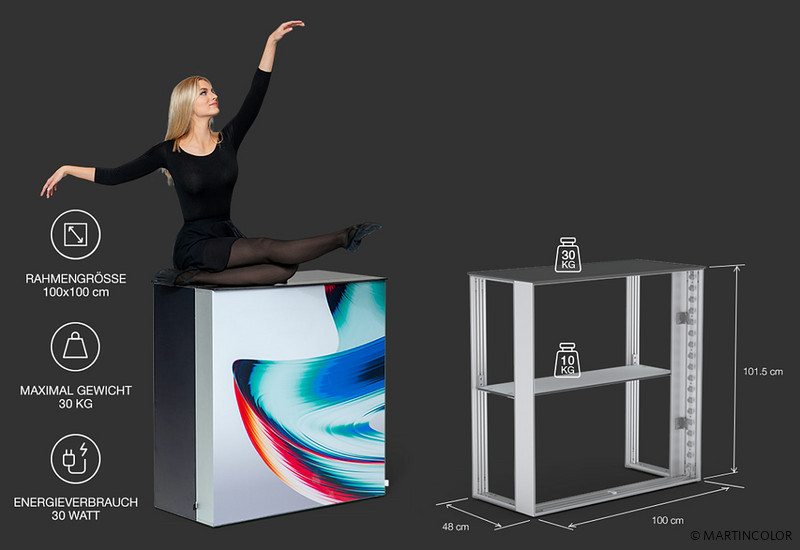 NEW: The ALU STAR PLUS LED counter can be fitted with a rechargeable battery. The illuminated counter can also be used in the middle of a trade fair stand without a cable in the way!