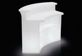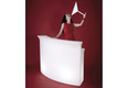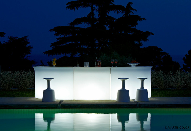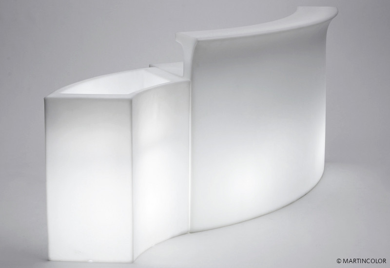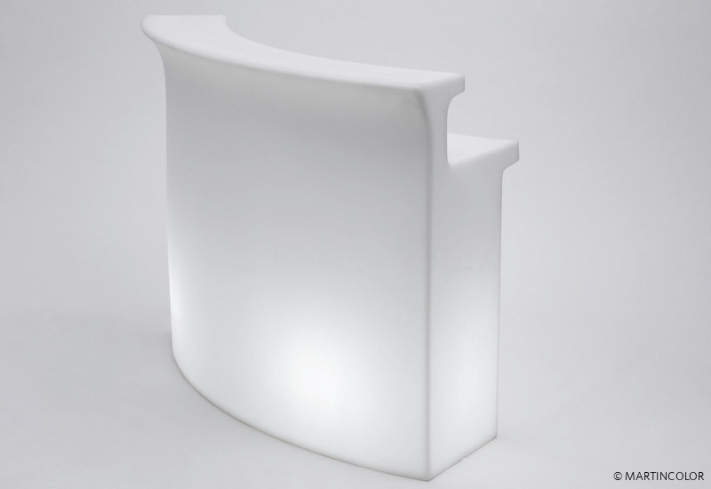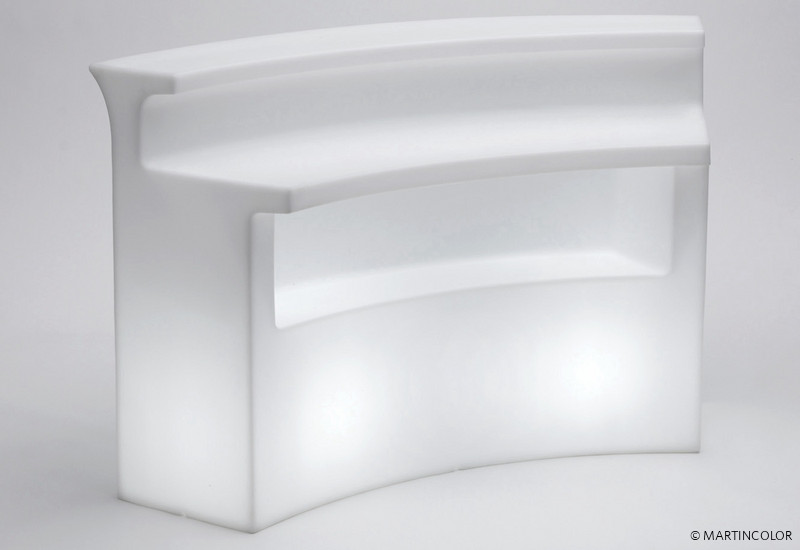Modern illuminated bar by slide design. This robust lighting furniture is made of polyethylene in rotational molding technology. So this BREAK BAR can be used not only indoor but also outside on the terrace or in the garden without hesitation. With two energy-saving lamps, this bar can be adequately highlighted. For bottles, jars and other utensils another shelf space is available.