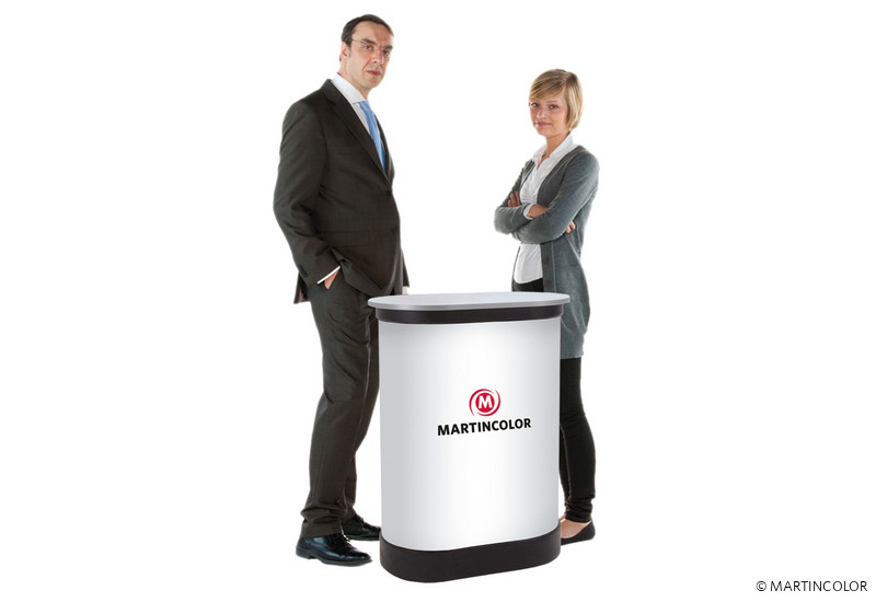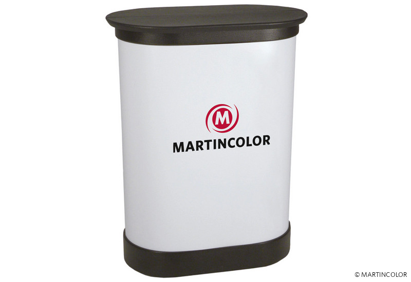 The transport case PRO is a counter and a rolling suitcase in one. The trolley is big enough to carry a TravelStand PRO folding screen folding screen. During your trade fair or exhibition, the transport case can then be converted into a bar within seconds. An individual graphic banderole is placed around the suitcase body and fastened by means of Velcro tape. The supplied counter plate is hinged and therefore easily stowed in the body. It is available in the surfaces silver, black, white and wood colors.