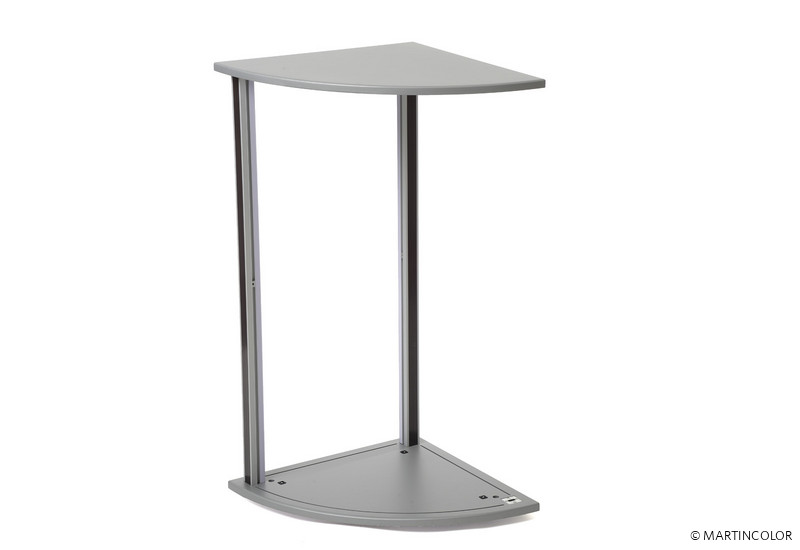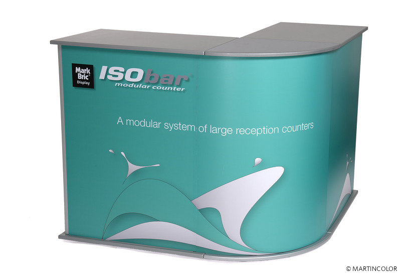 ISObar - this is the ultimate reception desk! It consists of modular individual elements, which together make up a complete large countertop unit. There are curved or straight modules available, which can be connected to each other. Thus, a composition of 7 sets results in a semicircular counter processing. The entire counter can be fitted with an individually printed graphic panel, making it a magnet on every stand. ISObar has silver-gray counter tops and each set has a shelf.