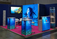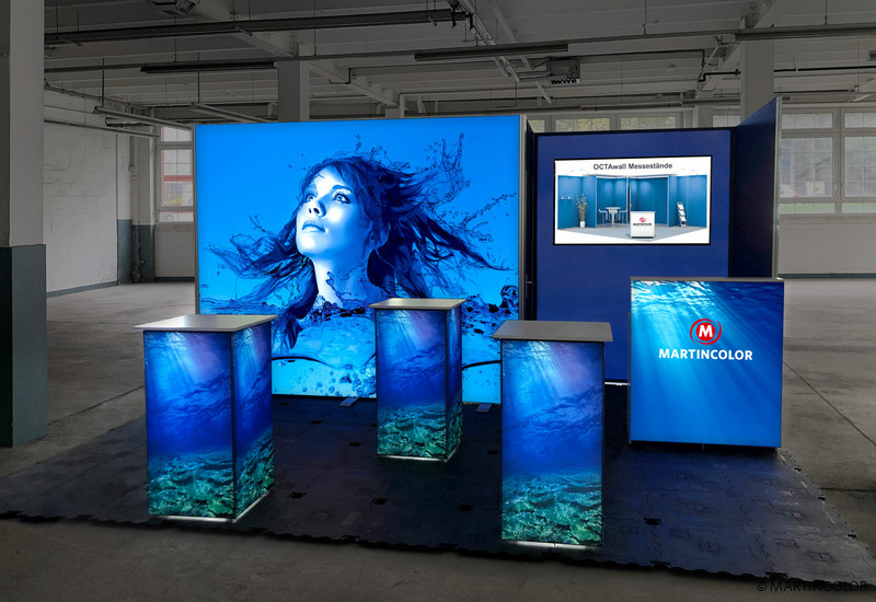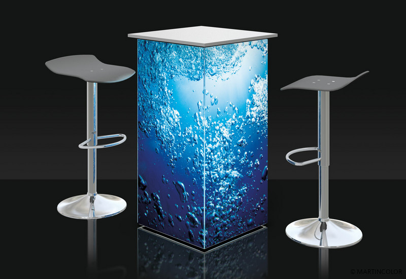 Forget conventional standing tables! Our LED standing table OCTALUMINA steals the show from any normal bar table because it scores with an advertising space on all four sides. In the counter body there is a POWER LED light that illuminates the standing table 360 degrees. 220 lumens per point of light put your company in the limelight. The stable aluminum profiles that form the corpus are covered with individually printed textile slides. The white countertop measures 57 x 57 cm. The height of the LED standing table is 103 cm.