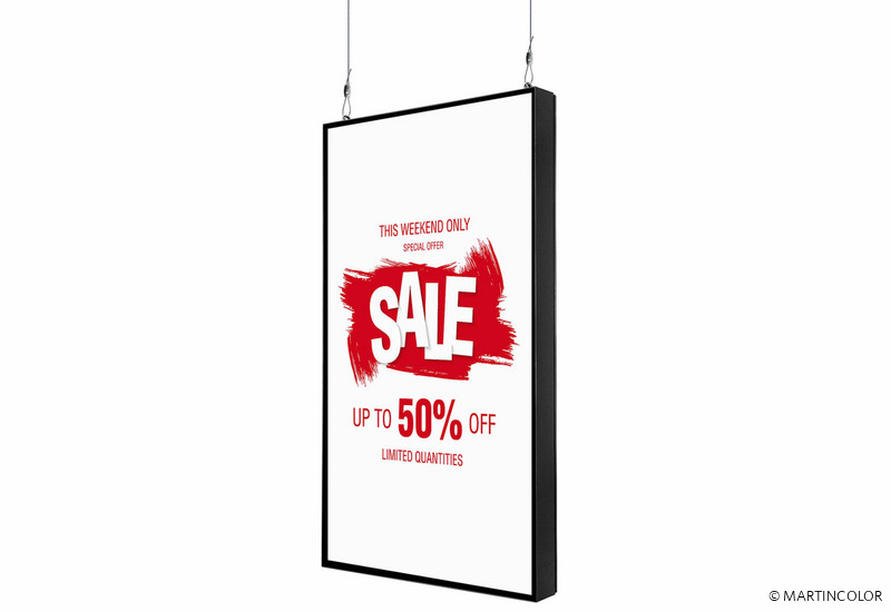 Our digital display "SMART" consists of an elegant, frameless construction, which is optionally available in white or black. On request, however, painting with RAL colors is also possible. The stable housing offers space for a 43-inch Ultra HD 4K screen, which is controlled with a remote control. The version is designed without a front cover. The digital display SMART is suitable for both ceiling and wall mounting and is used indoors. The professional Samsung screen is WLAN-capable and has a USB connection so that digital content such as videos, images or your website can be presented.