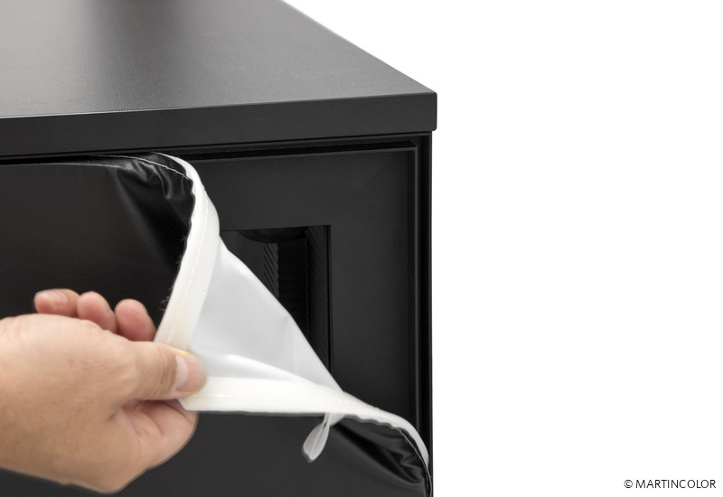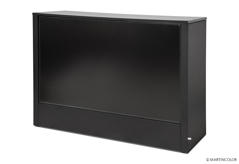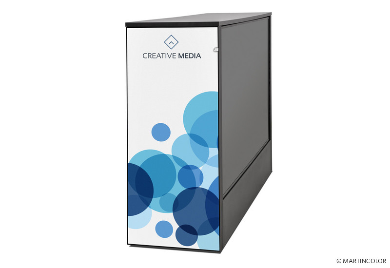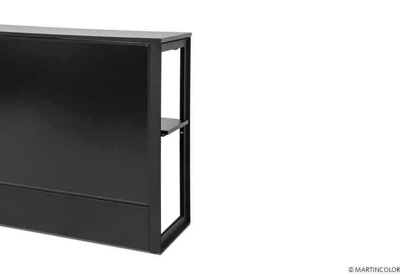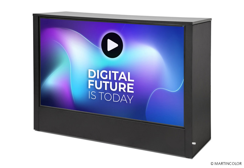 The black digital counter „FUTURE“ made of aluminium and steel is a real eye-catcher for your advertising message. This is ensured by the high-resolution (4K quality) video via the integrated 55“ Samsung screen and the individually designed textile prints on the side panels, which you can renew and replace at any time. Thanks to the tool-free assembly, the counter can be set up in no time at all. An integrated shelf inside allows you to store everything neatly. The counter is ready for use at any time and makes your company stand out at every event.
