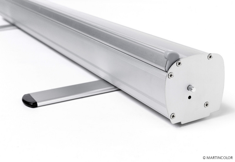 The Economy RollUp is one of the MARTINCOLOR bestsellers. It is a system made of aluminum, with two rotating feet and a carrying bag. The mechanics of a RollUp system are easy to explain. The hidden in the base of the system graphic can be presented by simply "pulling out". This process takes only a few seconds - and the advertising message is already visible! The graphics are printed on B1 certified Bannersoft material 720 dpi.