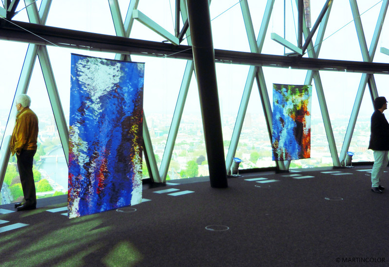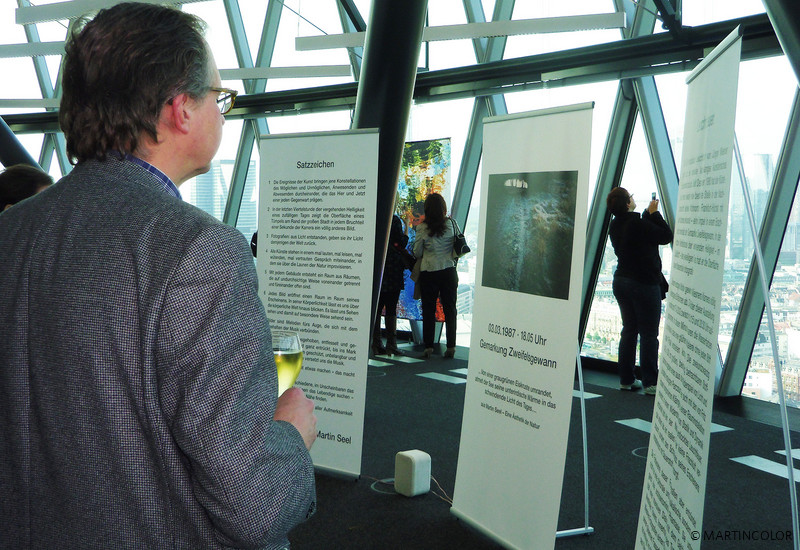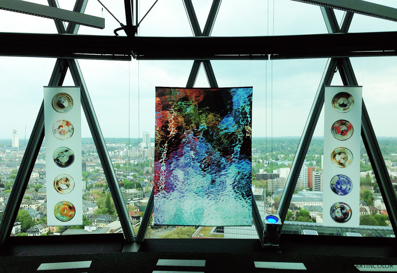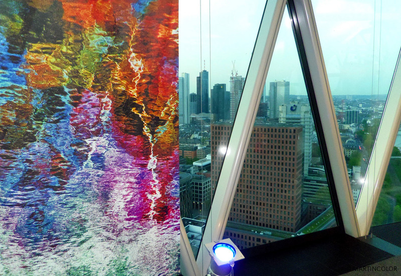 MARTINCOLOR unterstützt den Frankfurter Künstler Jürgen Wiesner bei der Umsetzung einer Banner-Installation mit einer Vielzahl von textilen Fahnendrucke. Die hochauflösenden Sublimationsdrucke wurden auf ein spezielles Dekomaterial gedruckt und anschließend in der hauseigenen Näherei von MARTINCOLOR konfektioniert. In der NACHT wird die 28. Etage des Westhafentowers, von der man einen grandiosen 360-Grad-Blick auf Frankfurt hat, mit der Bild-Installation „Leuchtfeuer“ inszeniert. Wiesners Werke zeigen ein einziges Motiv, einen See, der in der letzten Viertelstunde der vergehenden Helligkeit fotografiert wurde.