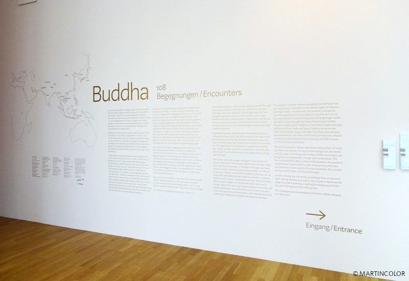 Die Ausstellung präsentiert insgesamt 108 herausragende Beispiele buddhistischer Kunst, hauptsächlich Skulptur, aus Indien, China, Tibet, Südostasien, Korea und Japan. Im Zentrum steht das Ebenbild des Gautama Buddha. 108 Bildnisse des Buddha ermöglichen 108 Begegnungen jenes Antlitzes, das ein von Menschen geschaffenes Ideal innerer und äußerer Friedfertigkeit verkörpert. Die Zahl 108 gilt in der buddhistischen Lehre als eine heilige Zahl, versinnbildlicht sie doch die 108 Bände der gesammelten Lehren des Gautama Buddha. In den buddhistischen Tempeln Japans wird in der letzten Nacht des Jahres die Tempelglocke 108 mal angeschlagen – jeder Schlag steht für eine der 108 irdischen Versuchungen, die es auf dem Weg ins Nirvana hinter sich zu lassen gilt.