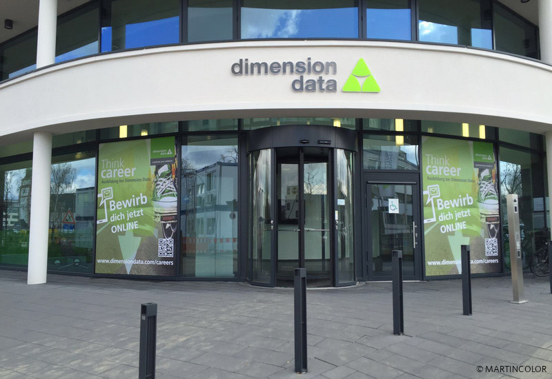 MARTINCOLOR unterstütze das amerikanische Unternehmen Dimension Data sowohl bei der Fassadengestaltung als auch bei der Umgestaltung der Büroräume. So wurden von unserem Montageteam Klebefolien auf Fenstern und Türen im Außenbereich als auch mit individuellem Branding versehene Tapeten auf den Büroetagen des Unternehmens angebracht. Auch der Druck der Outdoorfolien, Tapeten und Plakate wurde bei uns im Haus gefertigt. Martincolor hat bereits für viele Buroausstattungs-Projekte die gesamte Gestaltung, Produktion, Fertigung und Montage übernommen. Unser Montageteam besteht aus Handwerkern aus verschiedenen Bereichen, die wir je nach Einsatz individuell für Sie zusammen stellen. Wir montieren für Sie alle Acrylbilder, Textil-Spannrahmen, Tapeten, Büroleitsysteme, Fensterbeklebungen, Beschriftungen, Bau- & Werbeschilder, Fassadenbanner, Leuchtkästen uvm. Egal, ob in Ihrem Büro, bei Ihrem Kunden, auf dem Messestand oder Event (In- und Outdoor). Mehr Informationen und Preise erhalten Sie von unserem Spezialisten unter 069-756080-27.