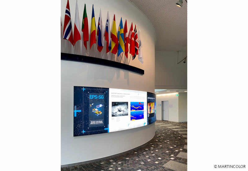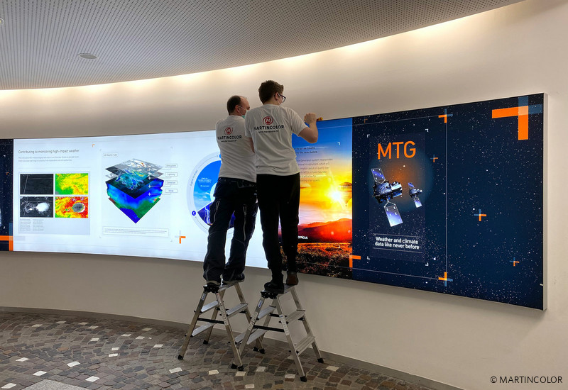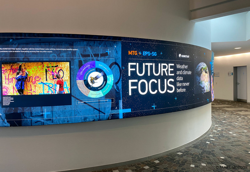 Für das Entrée der Europäische Organisation zur Nutzung meteorologischer Satelliten (EUMETSAT) fertigten wir großformatige, konkave und konvexe LED-Leuchtwandsysteme. Die in einer Länge von über 12 m gefertigten LED-Leuchtrahmen besitzen eine Bautiefe von 4 cm. Die Bespannung des Leuchtrahmens erfolgte über hochauflösenden, farbstarken UV-Druck, der umlaufend mit einem Gummikeder konfektioniert wurde. Mittels diesem Gummikeder wird das XXL-Spanndia in den Rahmen eingesteckt.