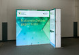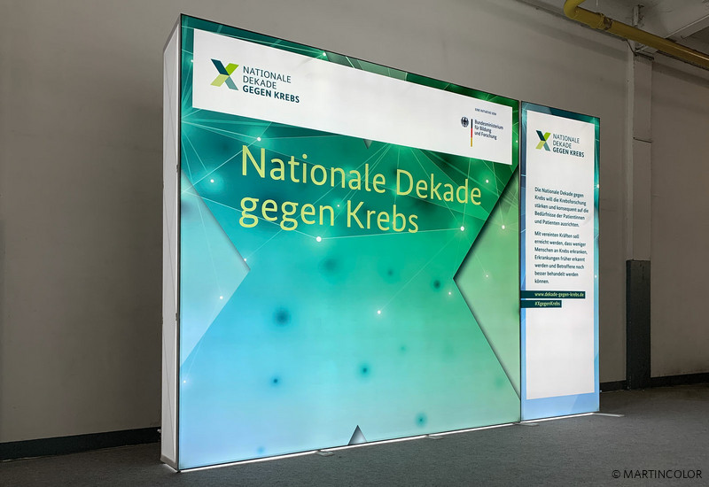 Im Auftrag der Agentur PR PETUUM produzierten wir für das Bundesministerium für Bildung und Forschung die modulare und mobile LED-Messewand GRID Lightbox. Ganz wie die bekannten Faltdisplays, besteht die GRID Lightbox aus einem Scherengitter und ist in Nullkommanichts "aufgepoppt". Zu einer Leuchtwand wird das System nun durch rollbare LED-Gardinen, die in die Scherengitter-Struktur eingehängt werden. Nun wird nur noch vorne und hinten eine textile Diabespannung eingesteckt - fertig ist die Leuchtwand. Unsere GRID Lightbox Leuchtwände gibt es in fünf verschiedenen Formaten bis zu einer Breite von 375 cm. Alle Wände können modular miteinander kombiniert werden, sodass ein großer LED-Messestand entsteht. Überzeugend ist auch der Transport. Alle Leuchtwände lassen sich klein zusammenfalten und in einem handlichen Trolley transportieren.