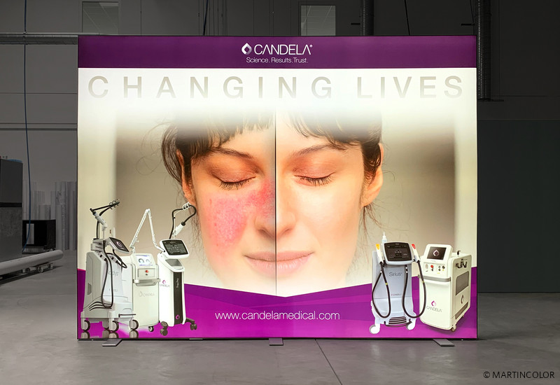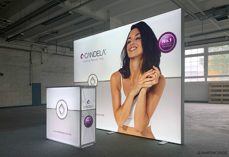 Beeindruckend in Leuchtkraft und Wirkung ist unsere LED-Messewand ALU STAR. Durch ihre modulare Konstruktionsweise lässt sich die ALU STAR Leuchtwand in vielen unterschiedlichen Formaten einsetzen. Das Grundmodul besitzt eine Breite von 200 cm und kann um Teilstücken von 50 cm, 75 cm und 100 cm erweitert werden. Diese Wandlungsmöglichkeit begeisterte unseren Kunden Candela Laser Deutschland GmbH. Auf dem gezeigten Foto sehen Sie eine ALU STAR LED-Leuchtwand im Format B: 300 cm und H: 230 cm. Damit die LED-Messewand als eigenständiger Messestand eingesetzt werden kann, wurde die Leuchtwand mit einer GRID LED-Theke kombiniert. Mehr Informationen und Aufbauvideos zu ALU STAR finden Sie unter https://www.martincolor.de/messestaende/leucht-messestaende/alu-star.html