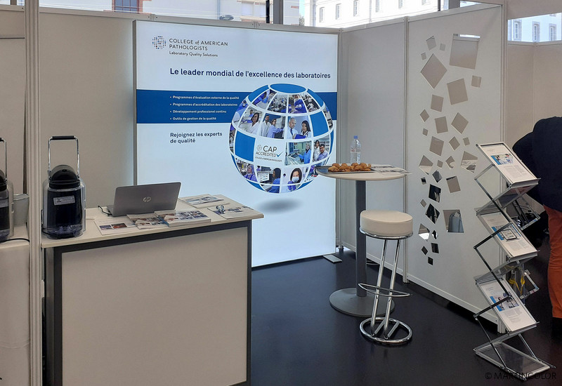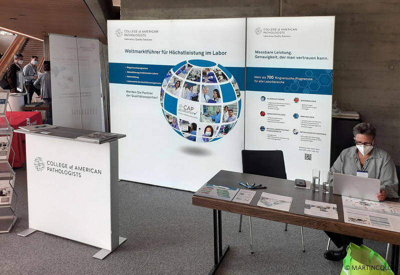 LED-Messewände sind auch bei kleineren Hausmessen, Kongressen und Recruiting-Veranstaltung der ideale Partner. Hier sehen Sie einen ALU STAR Messestand, der sowohl solitär, also ohne Messekabine, wirkungsvoll aufgebaut werden kann, als auch als Rückwand auf einem Messestand mit Messekabine. Durch die Möglichkeit mehrere LED-Messewand Formate einzusetzen, können die einzelnen Wände gerade oder über Eck miteinander verbunden werden. Die opimale Ergänzung zu einer LED-Messewand ist eine LED-Theke. Unser Kunde "College of American Pathologists" verwendet hier die ALU STAR Basic Theke. Mehr Informationen erhalten Sie auch gerne telefonisch unter 069-756080-84 oder senden Sie uns eine EMail mit Ihrer Anfrage.