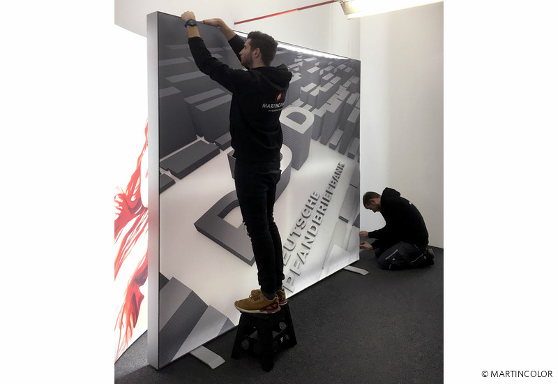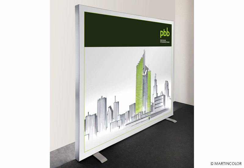Für eine aufmerksamkeitsstarke Präsentation auf kleineren Messen und Kongressen fertigten wir für die Deutsche Pfandbriefbank AG einen großformatigen Leuchtkasten. MARTINCOLOR ist Spezialist für mobile Leuchtdisplays und unser Angebot an mobilen, leicht aufbaubaren Leuchtwänden ist vielseitig. Die Deutsche Pfandbriefbank AG entschied sich für die mobile Leuchtwand OCTALUMINA. Der besondere Vorteil von OCTALUMINA Messe-Leuchtwänden ist, dass sie in der Größe individuell nach den Vorgaben und Wünschen unserer Kunden gefertigt werden können. Je nach Transportmöglichkeiten, können die Aluminiumprofile des Leuchtsystems transportfreundlich geteilt werden. Auch der Aufbau der leuchtenden Messewand ist denkbar einfach. Da sich die LED Beleuchtung vormontiert direkt in den Aluminiumprofilen befindet, müssen diese zum Aufbau nur zusammengesteckt und verbunden werden. Für die Bespannung mit individuellem Grafikdruck kommt ein besonders leuchtstarkes Diamaterial zum Einsatz. Wie viele Messesysteme aus dem OCTANORM Programm auch, werden OCTALUMINA Leuchtdisplays doppelseitig mit Grafik bespannt.