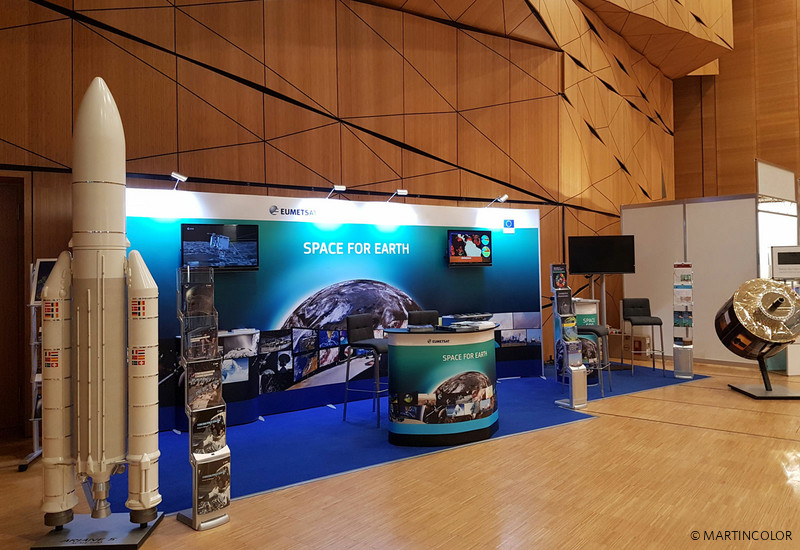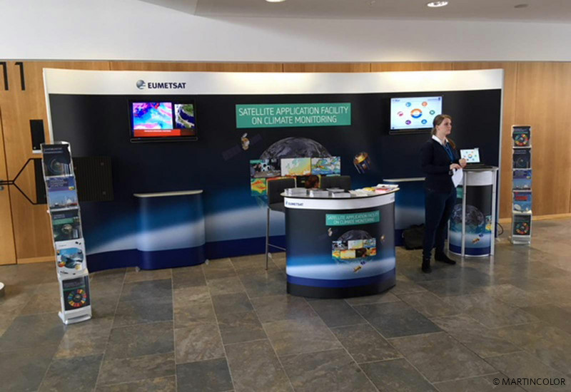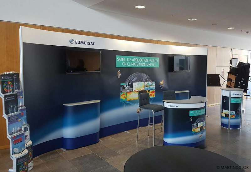MARTINCOLOR fertigte für die europäische Organisation für die Nutzung meteorologischer Satelliten, EUMETSAT, eine flexible Messestandlösung. Zum Einsatz kam das beliebte ISOframe Wave System, dass sich individuell an die jeweiligen Messegegebenheiten anpassen lässt. Bei der Veranstaltung "Wissenswerte 2017" in Darmstadt kamen neben flexiblen Grafikbahnen auch 2 Bildschirm-Module zum Einsatz. Bildschirm-Module aus der ISOframe Wave Familie sind mit allen anderen Modulen von ISOframe einfach zu verbinden und flexibel einzusetzen. Kombiniert wurde der Messestand mit einer aufklappbaren Theke von EXPAND, der EXPAND Podium Case, sowie einer transportablen und klein zusammenfaltbaren Theke TWIST. Alle diese Systeme finden Sie auch bei uns im Internet unter dem Bereich "Präsentationssysteme".