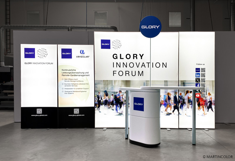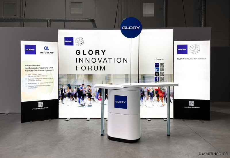 Die ALU LightUp und PIXLIP POP LED-Messestandsysteme waren, mit ihrem günstigen Preis-Leistungsverhältnis und ihrer äußerst überzeugenden Leuchtkraft, die Messestandlösung für unseren Kunden GLORY. Beide Leuchtsysteme eignen sich wunderbar für jede Art von Veranstaltungen. Sie sind werkzeuglos schnell und einfach auf- und abzubauen, auch für ungeübte Personen. Das textile Diamaterial lässt sich jederzeit kinderleicht austauschen, so dass die Frontseite der LED-Displays immer topaktuell ist! Die in der Mitte stehende Messetheke PENTA-LOOOP® ist ebenfalls ein wahrer Blickfang. Sie lässt sich in Windeseile und ohne Werkzeug in zahlreichen Anordnungen aufbauen und funktioniert wie ein Schweizer Taschenmesser. Zudem können Sie diese auch mit Ihrem Firmenlogo personalisieren.